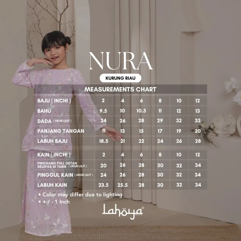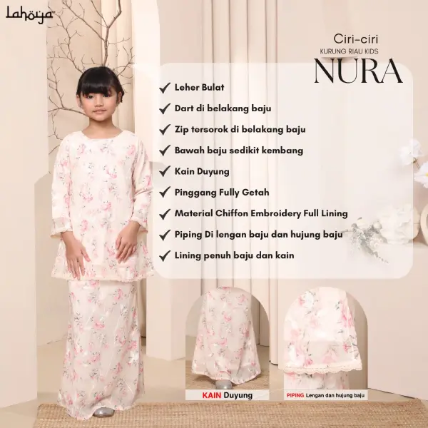 Lahoya Kurung Nura (Kurung Riau Kids ) dengan corak fabrik yang lebih Moden dan Terkini sesuai untuk kanak-kanak yang berumur dari 1 tahun – 12 tahun.