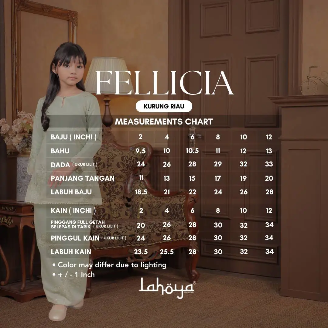 Lahoya Kurung Fellicia (Kurung Riau Kids ) dengan corak fabrik yang lebih Moden dan Terkini sesuai untuk kanak-kanak yang berumur dari 1 tahun – 12 tahun.