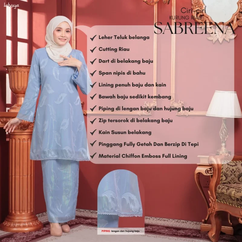 Lahoya Kurung Sabreena (Kurung Riau) dengan corak fabrik yang lebih Moden dan Terkini sesuai untuk semua golongan.