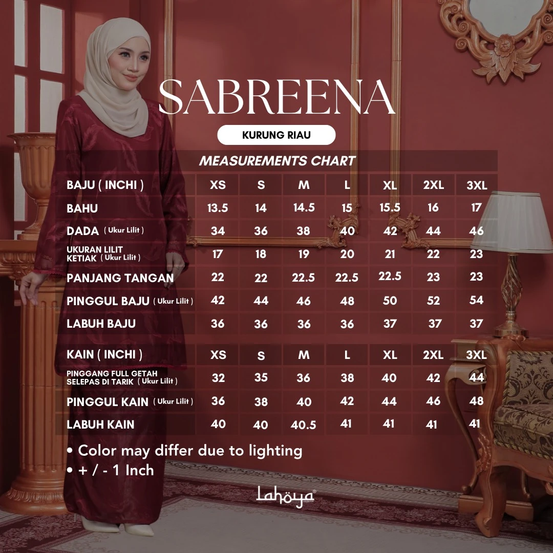 Lahoya Kurung Sabreena (Kurung Riau) dengan corak fabrik yang lebih Moden dan Terkini sesuai untuk semua golongan.