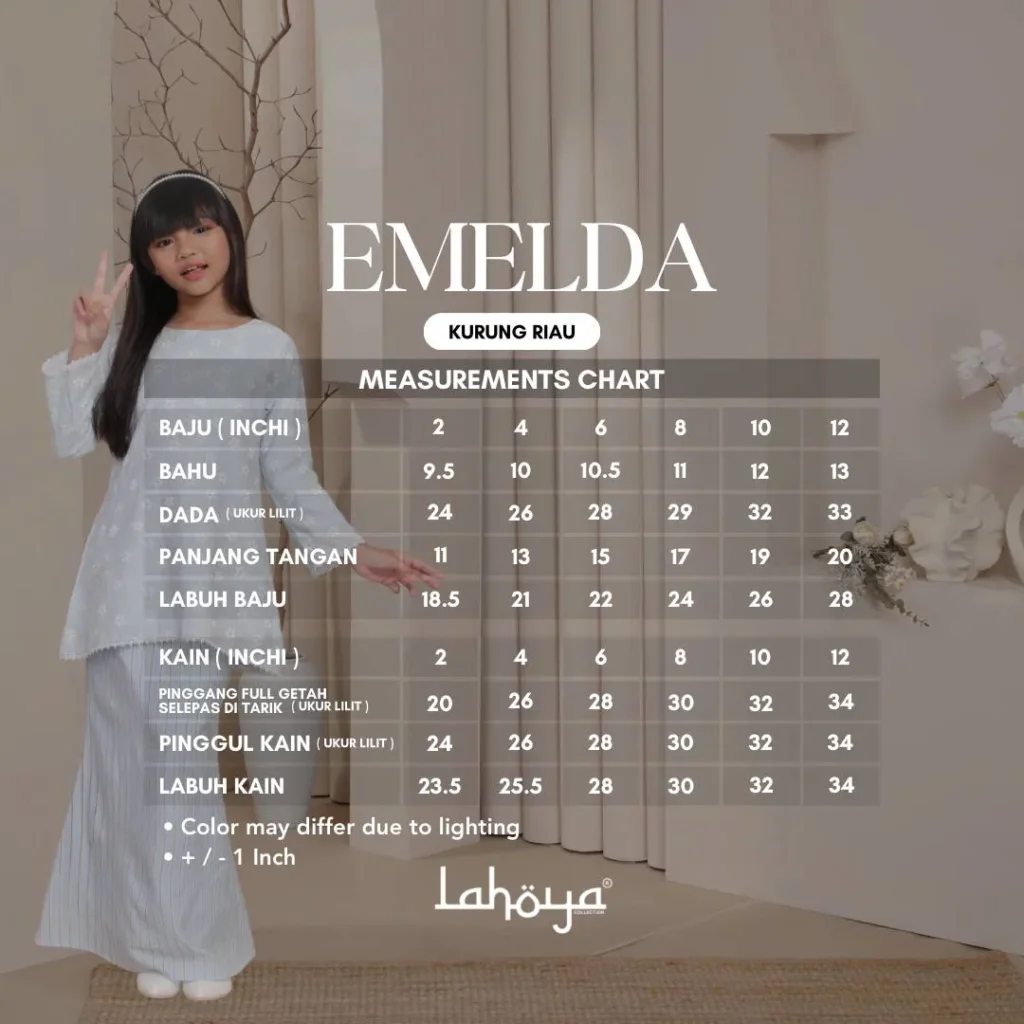 Lahoya Kurung Emelda (Kurung Riau Kids ) dengan corak fabrik yang lebih Moden dan Terkini sesuai untuk kanak-kanak yang berumur dari 1 tahun – 12 tahun.