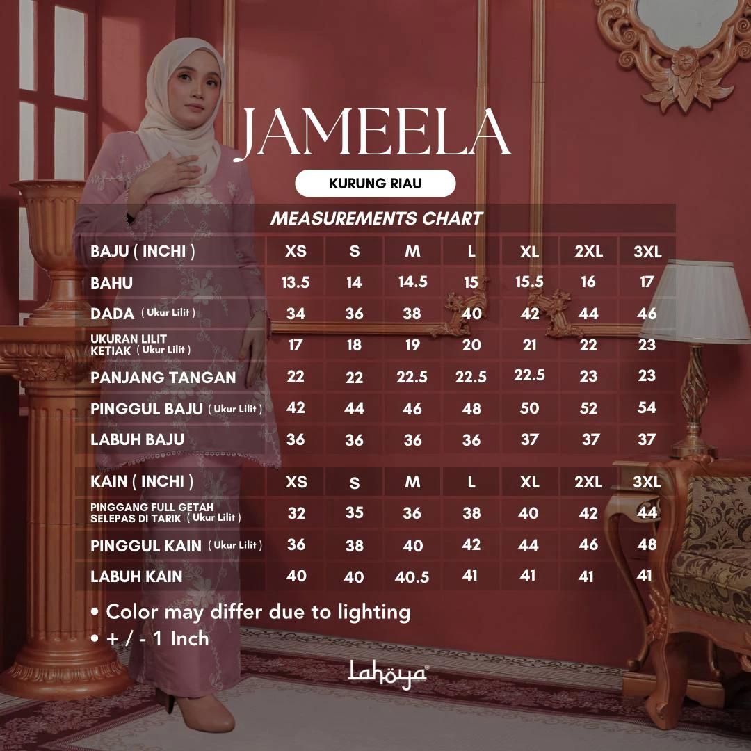 Lahoya Kurung Jameela (Kurung Riau) dengan corak fabrik yang lebih Moden dan Terkini sesuai untuk semua golongan.