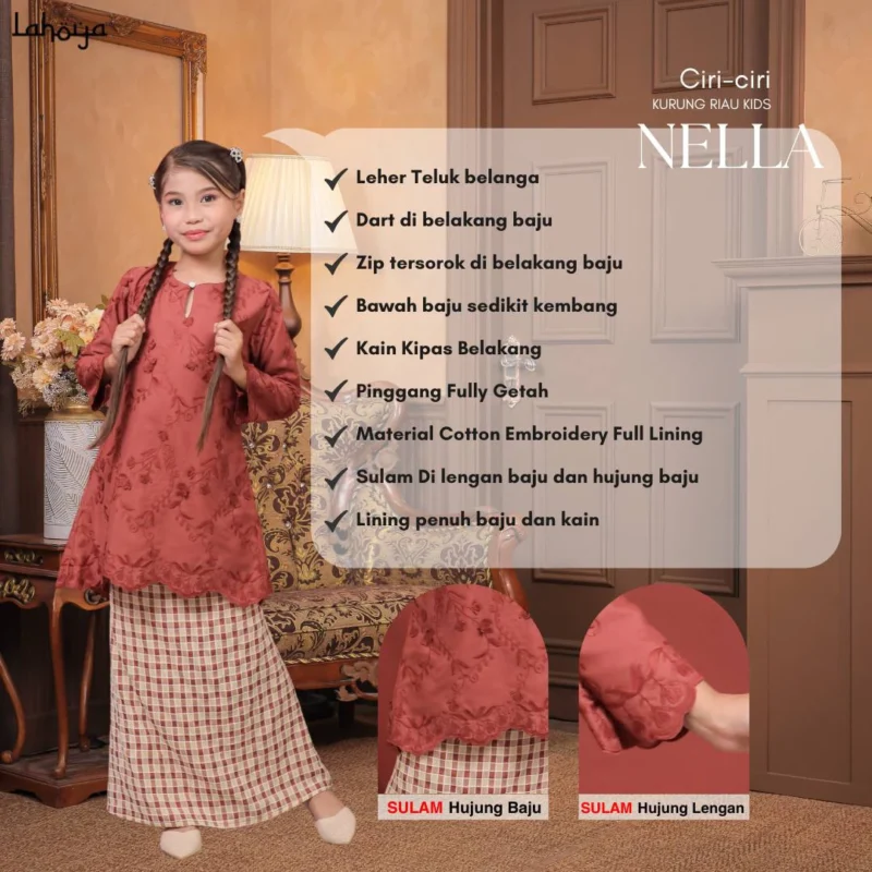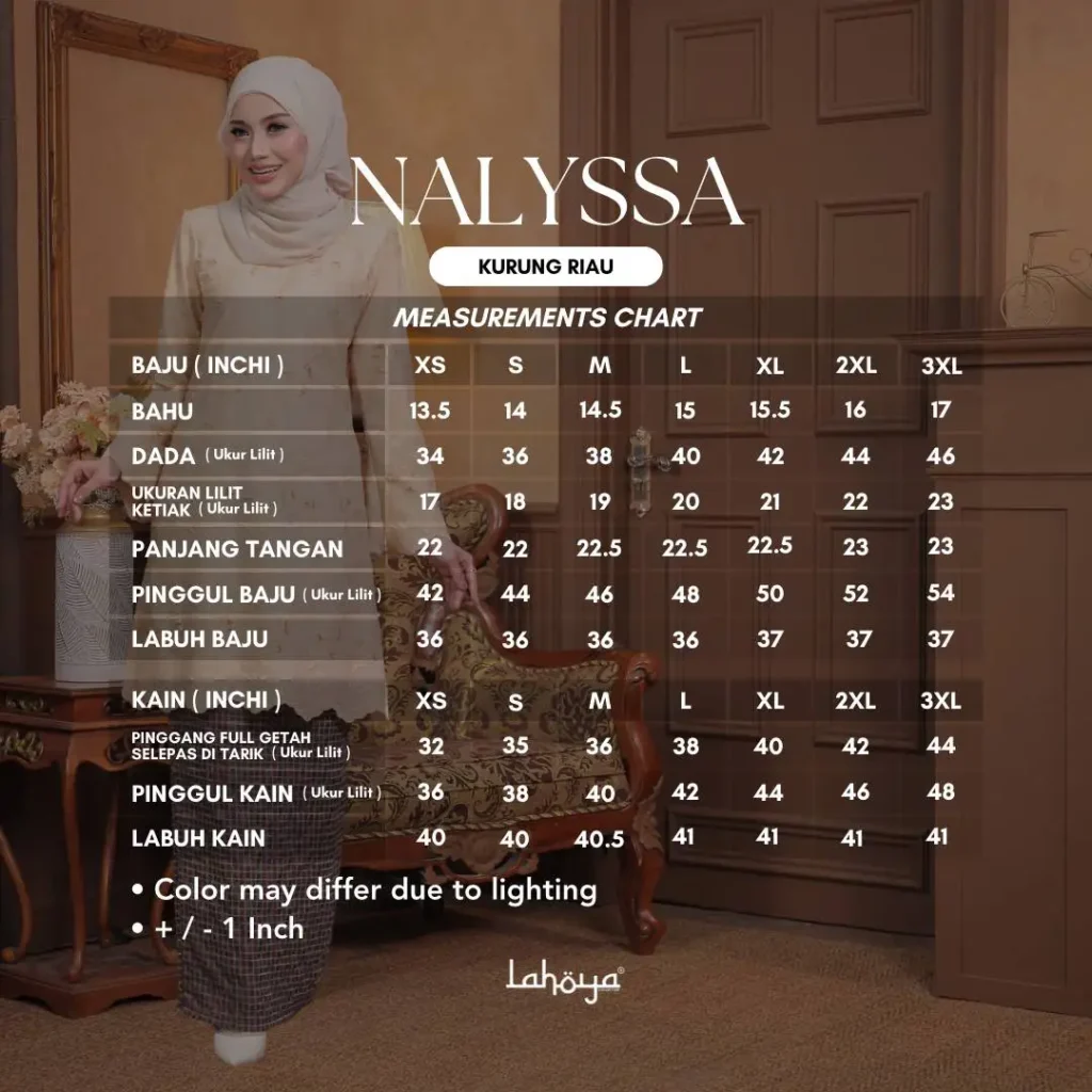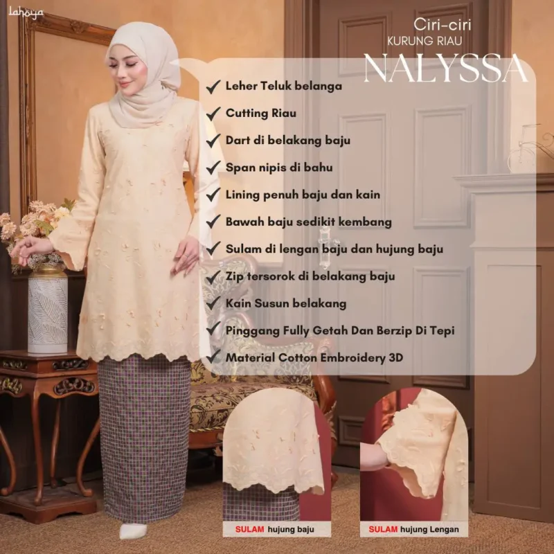 Lahoya Kurung Nalyssa (Kurung Riau) dengan corak fabrik yang lebih Moden dan Terkini sesuai untuk semua golongan.
